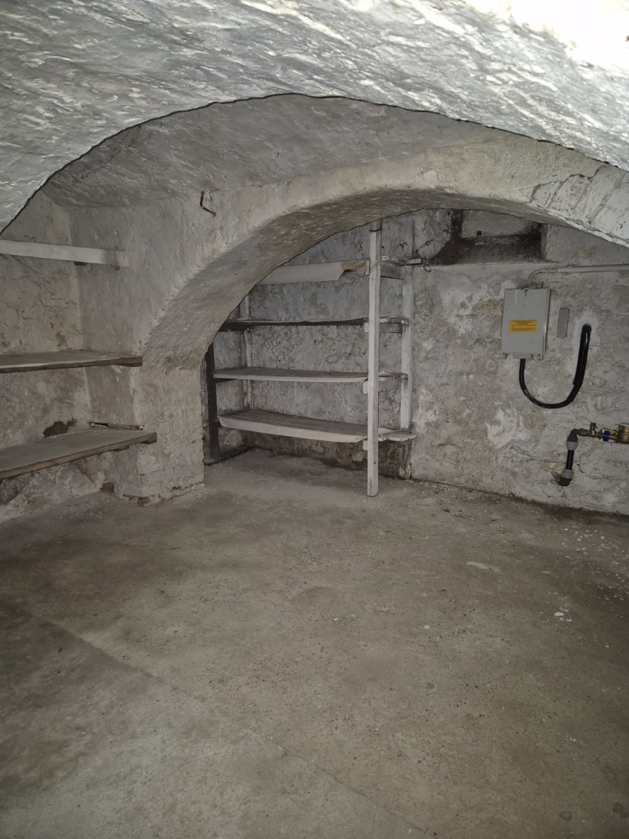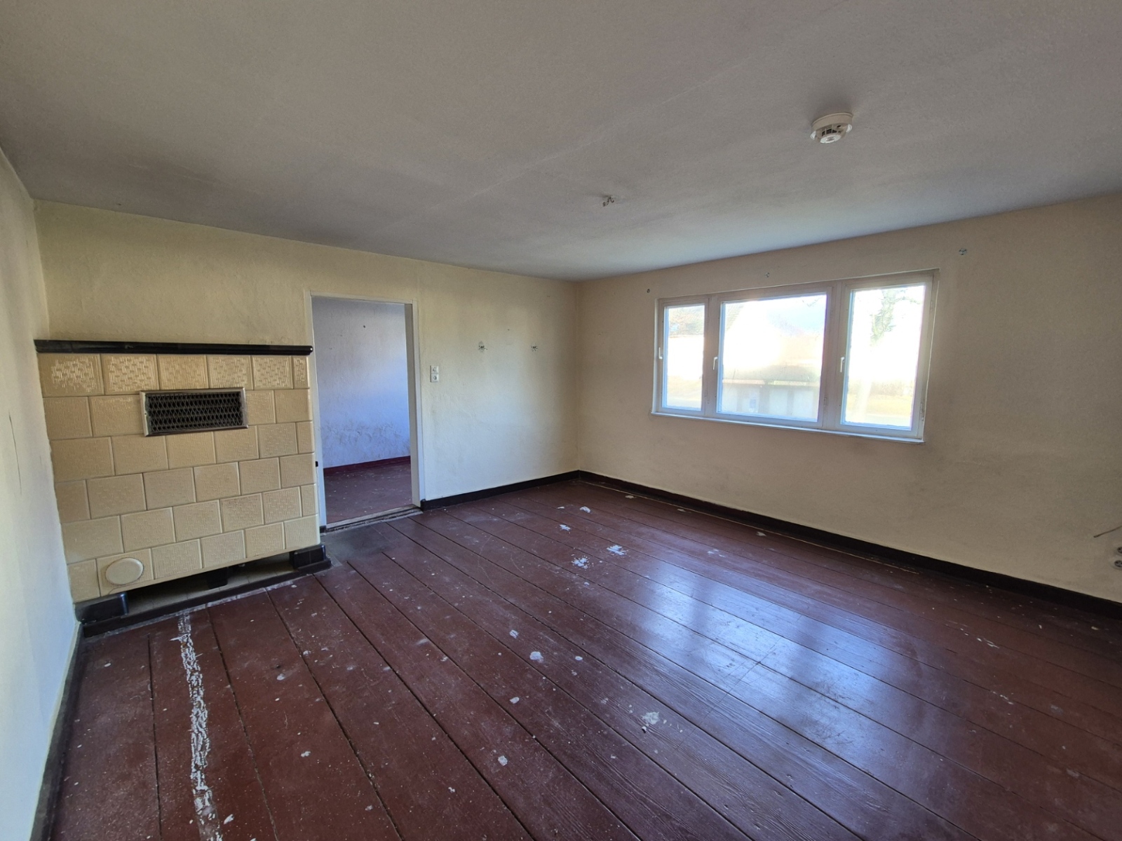 Auf derselben Ebene befinden sich zwei weitere Räume: ein Durchgangszimmer – hell, ruhig, mit klaren Linien und ordnender Struktur – ideal als Arbeitszimmer. Das Wohnzimmer strahlt Gemütlichkeit aus, mit heller Fensterfront und integriertem Kachelofen, der besonderen Charme verleiht. In vielen Räumen sind Holzdielen aus dem Baujahr (ca. 1880) verlegt, die jeden Schritt lebendig klingen lassen. Einfachverglaste Holzfenster geben Einblick in die historische Baukunst des letzten Jahrhunderts. Unter der Küche liegt ein uriger Kellerraum mit Gewölbedecke – eine gediegene Atmosphäre für Weinpräsentationen, Hobbywerkstatt oder kühlen Lagerraum.