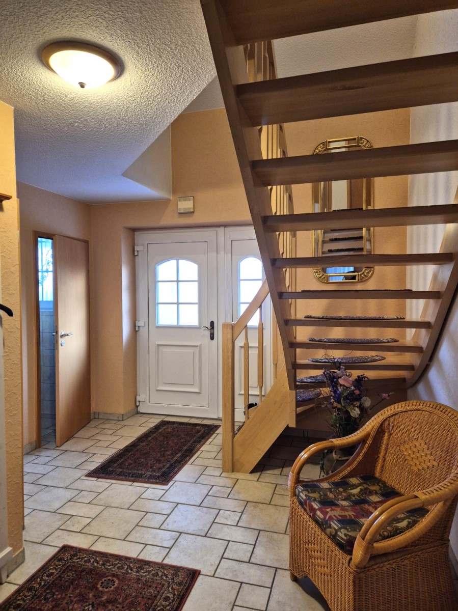 1998 in massiver Bauweise von Heinz von Heiden errichtet, verbindet dieses Einfamilienhaus zeitlose Qualität mit modernem Wohnkomfort. Beim Betreten begrüßt ein heller Flur den Zugang zu allen Räumen, die barrierefrei erreichbar sind. Rechts befinden sich ein gepflegtes Gäste-WC und der praktische Hauswirtschaftsraum mit neu installierter Gastherme (2023) sowie ausreichend Stauraum.
