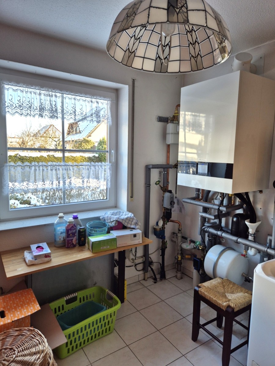 Eine auf dem Dach installierte Solarfläche liefert Warmwasser. Eine Entkalkungsanlage sorgt für besonders reines Wasser, während die Abwasserentsorgung über eine ortsübliche Sammelgrube erfolgt. Die Lehmverputz-Wände unterstützen ein gesundes Raumklima. Das Haus nutzt Gasheizung und einen Ofen im Wohnzimmer für effiziente, behagliche Wärme. Im Haus und Garten finden sich zahlreiche Steckdosen, die flexible, dekorative Gestaltung ermöglichen.