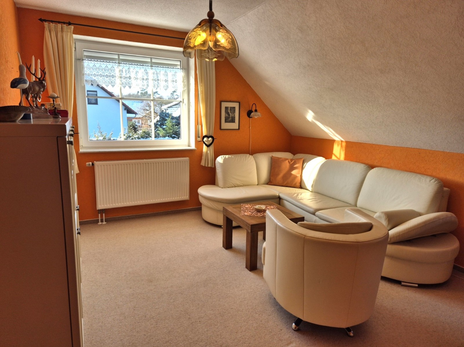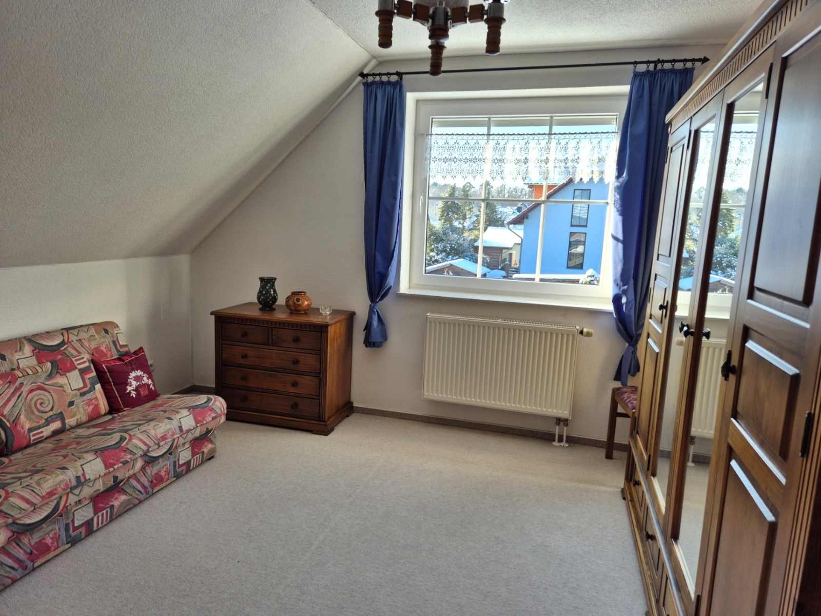 Das Dachgeschoss wurde im Jahr 2023 vollständig saniert und instand gesetzt. Es entstand eine helle, behagliche Wohnatmosphäre mit drei Zimmern. Die großzügigen Dachgauben schaffen eine freundliche, offene Raumwirkung und ermöglichen einen Blick ins Grüne.